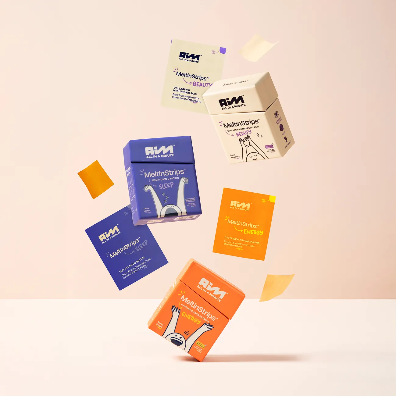 A flat lay photograph of several products from AIM Nutrition's 'MeltinStrips' line, including blue boxes for 'Sleep' and white boxes for 'Beauty,' along with small orange sachets for 'Energy,' all scattered on a light background