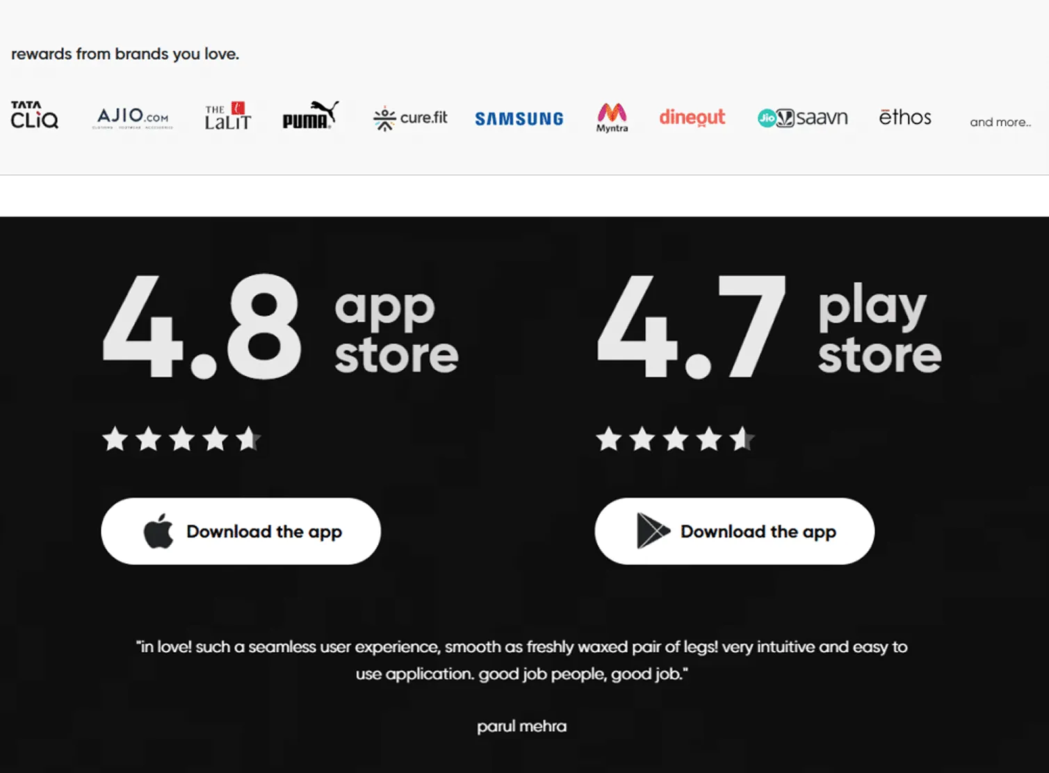 Cred starts building credibility the moment a user lands on the home page. They talk about their humongous user base of 9M+ members, and further talk about their association with big brands. This builds trust as well as a feeling of FOMO, which are both important factors when it comes to conversion.