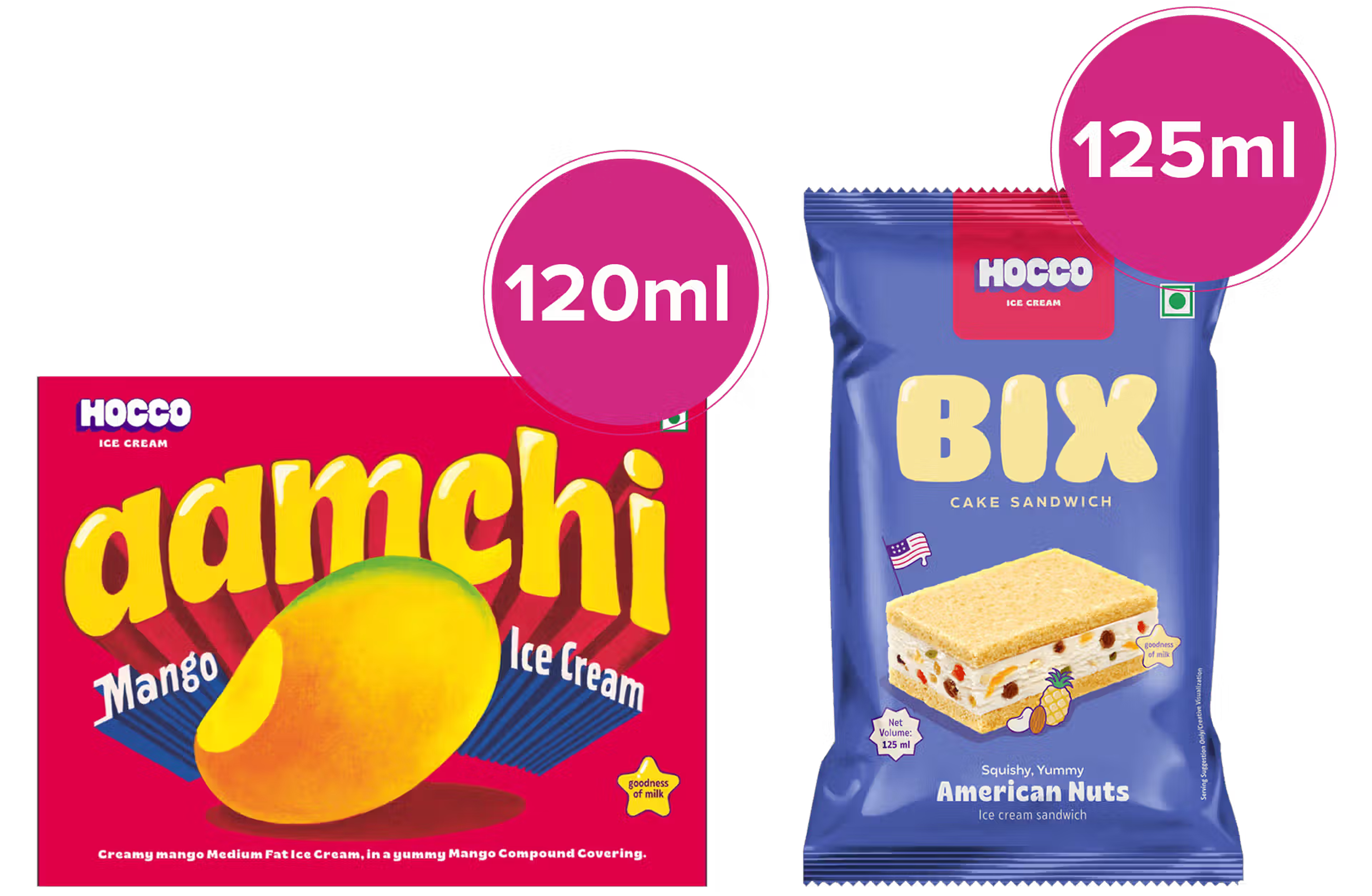 Naming is where Hocco truly flexes its creativity. Instead of generic names like “Mango Bar” or “Chocolate Cone”, the brand has built a fun, culture-first vocabulary like Aamchi for mango, Oh! Cone for cones, Bix for sandwiches.