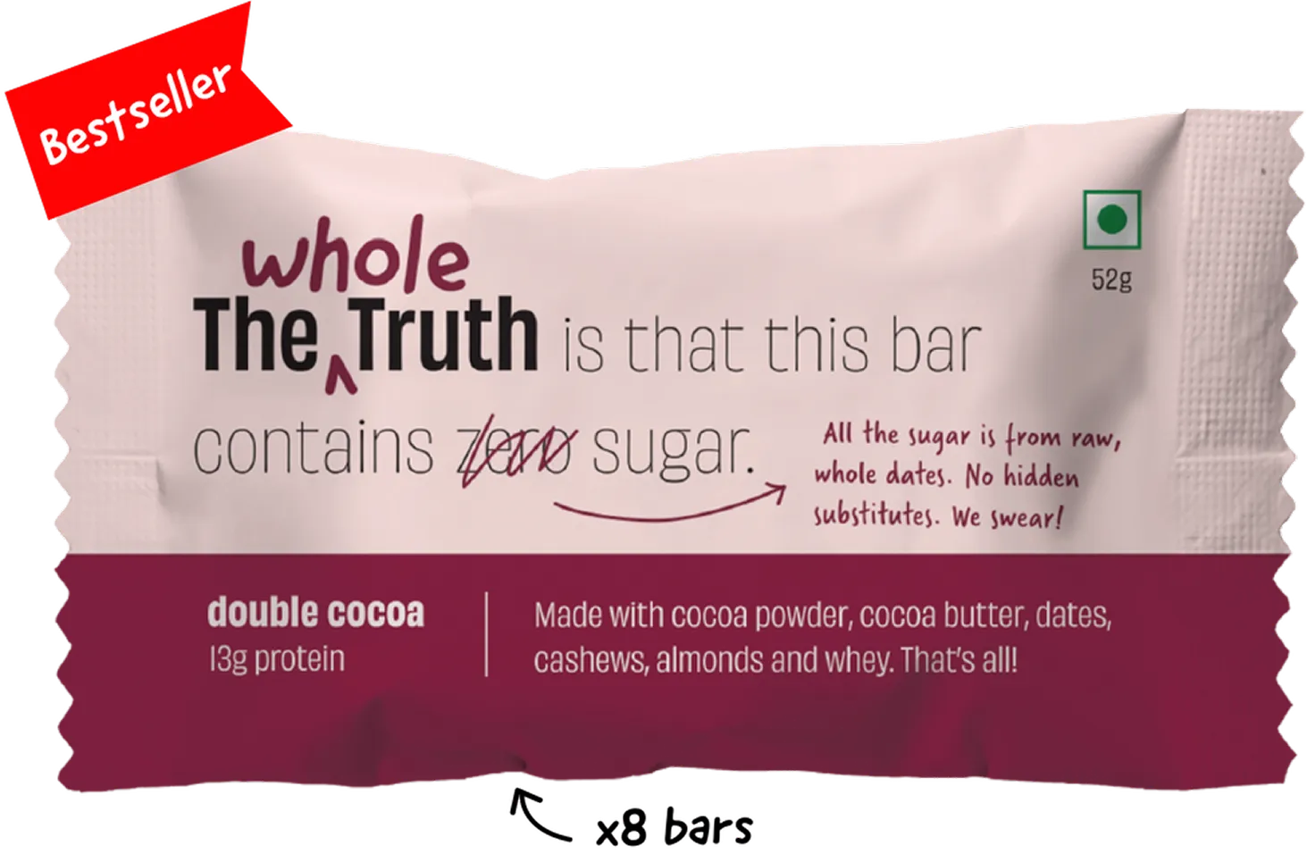 The Whole Truth doesn’t just say it’s honest, it literally shows it to you. Ingredient lists appear on the front itself unlike other brands, it is not hidden on the back. Every pack tells you exactly what’s inside, there’s no fine print, no distractions. The brand’s logo and communication style build an instant credibility in the customer’s mind.