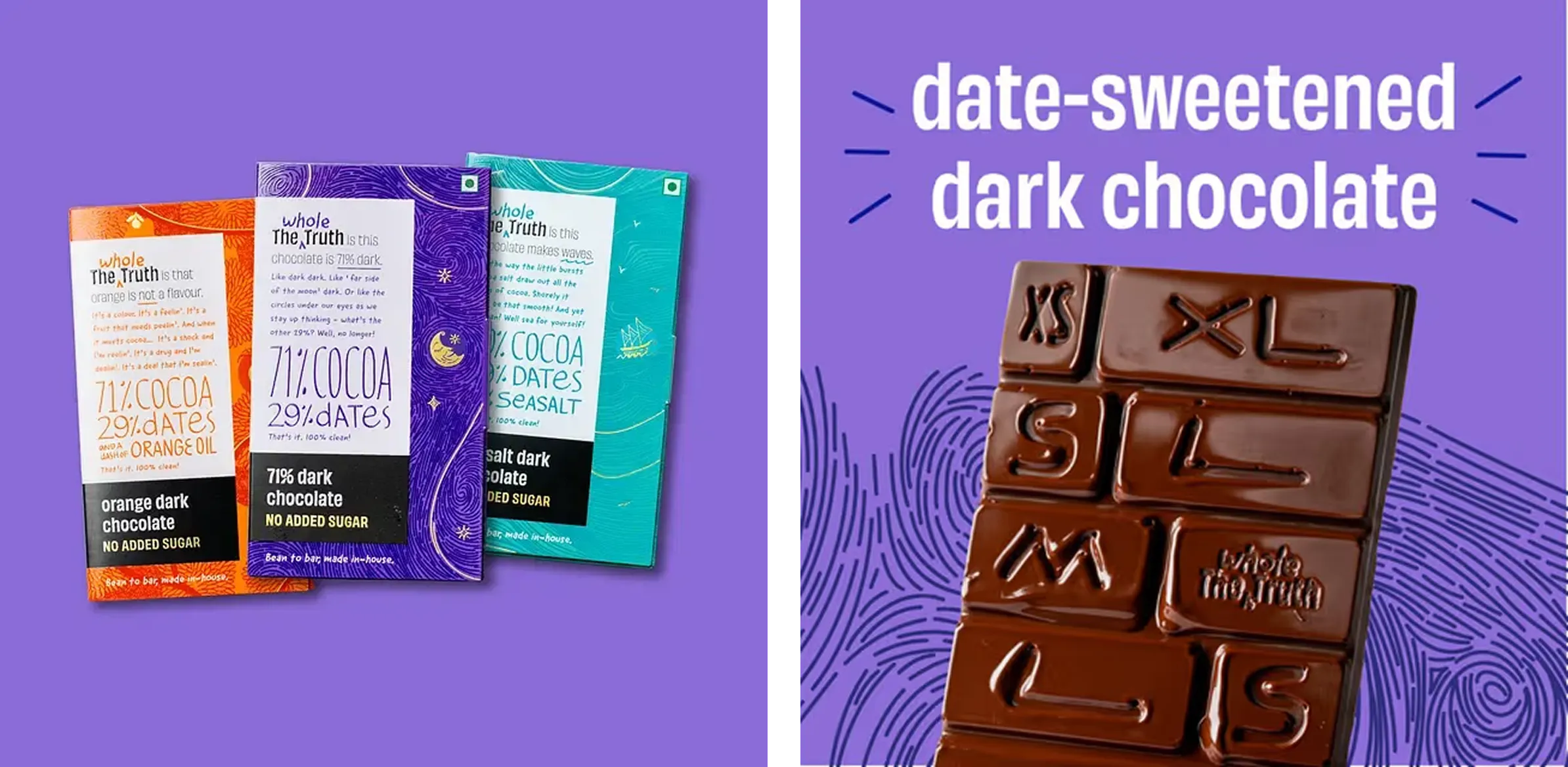 Even beyond the Whole Truth packaging, The Whole Truth branding extends thinking into the product itself. Its chocolate bars are not moulded like how traditional segmented chocolates are. Instead, they feature asymmetric pieces that mention sizes like “S,M,L,XL” that evoke a feeling of shareability and playfulness. Whether or not consumers actually share them is secondary, but what matters is the intention. It shows the depth of design consideration, proving the brand doesn’t just stop at clean communication but also designs for a rich personalised experience.