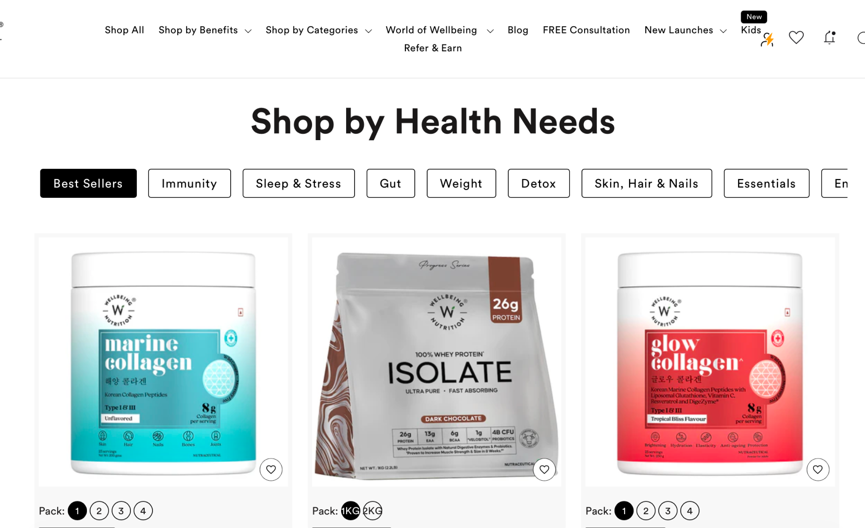 Wellbeing Nutrition's e-commerce website is structured around one of the most consumer-intelligent navigation choices in Indian D2C health: shop by benefit rather than shop by product.
