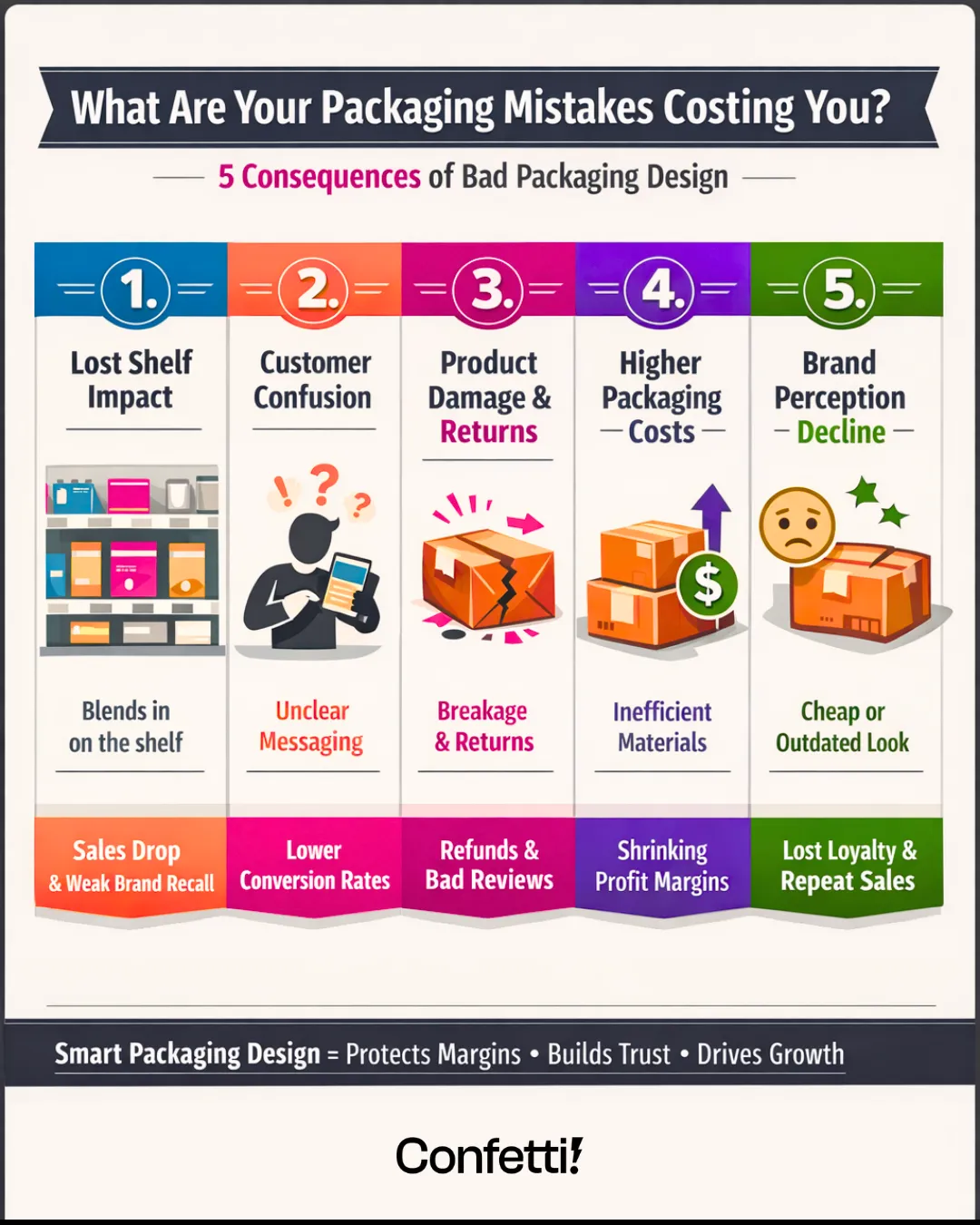 It also hurts shelf readability, can make the product appear cheaper or less trustworthy, and stops key benefits from standing out.