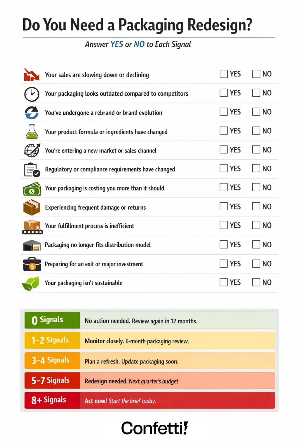 A packaging redesign is needed when your packaging no longer reflects your brand, fails to compete on shelf, or is costing you sales, customers, or compliance.