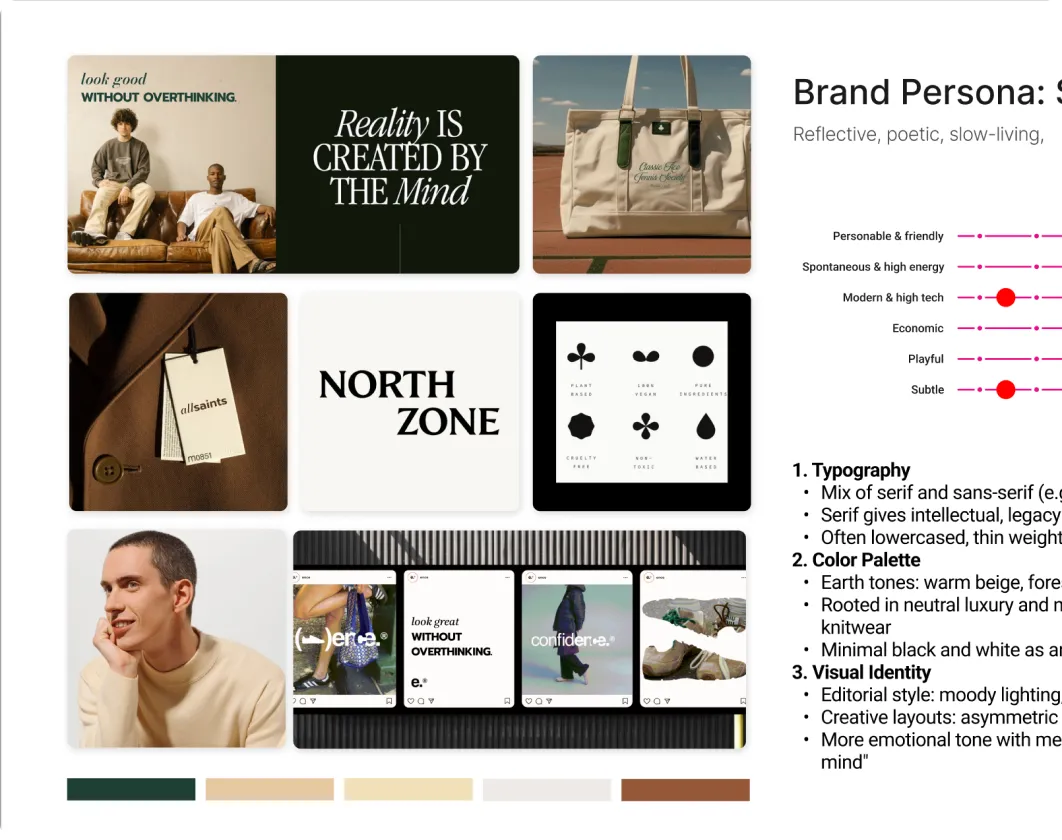 A strategic mood board goes well beyond images. Alongside visual references, it should include tone words, typography direction, colour mood, and basic visual rules that guide how everything comes together. These elements help designers understand not just what the brand might look like, but how it should behave visually. Things like spacing, hierarchy, and texture often matter as much as imagery, especially for brands that rely on restraint rather than decoration.