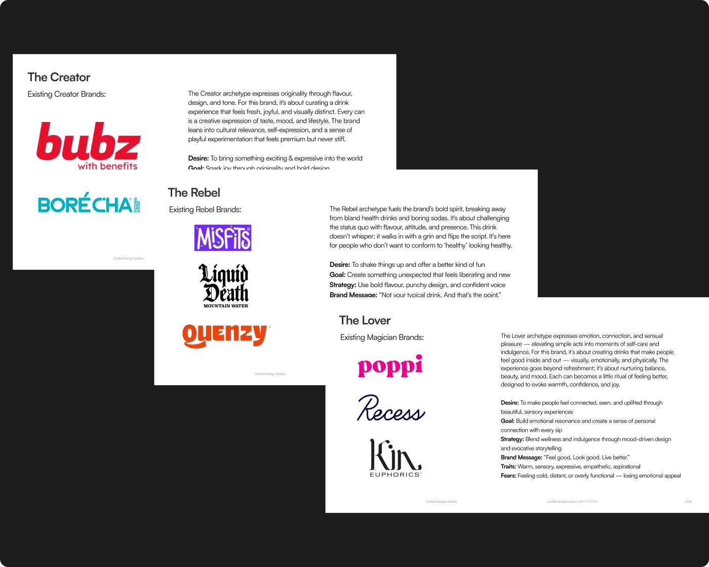 Every brand archetype Confetti defines is specific to the brand, the category, and the competitive landscape our client is working within. We do not apply archetypes loosely or by template. We derive them through a structured process rooted in competitor mapping, positioning strategy, and personality metrics, ensuring the archetype is both strategically sound and practically executable.