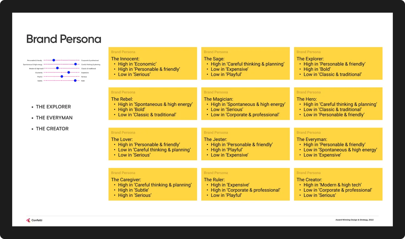 At Confetti, brand archetypes are not chosen based on intuition or internal preference. They are derived objectively from the strategic inputs established earlier in the brand strategy process. Once competitor analysis and brand positioning are in place, we map the brand across six personality dimensions, including friendly versus corporate, spontaneous versus careful, economical versus premium, and subtle versus bold.