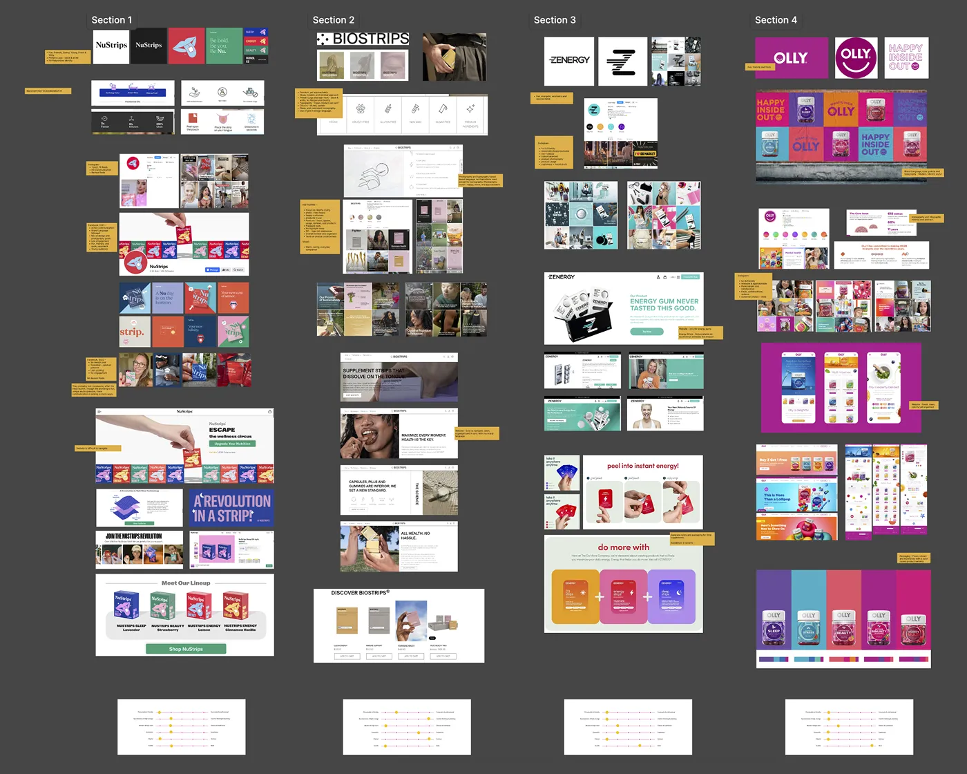 When we worked with All In A Minute (AIM), a wellness brand entering the format-innovation space, we analysed competitors including NuStrips, BioStrips, Z-Energy, OLLI, Wellbeing Nutrition, Ritual, The Patch Brand, and Goli Nutrition. Each brand was studied across their Instagram presence, packaging systems, websites, and broader digital communication. The analysis was not descriptive. Every brand was mapped using brand personality sliders, assessing where they sat across dimensions such as: