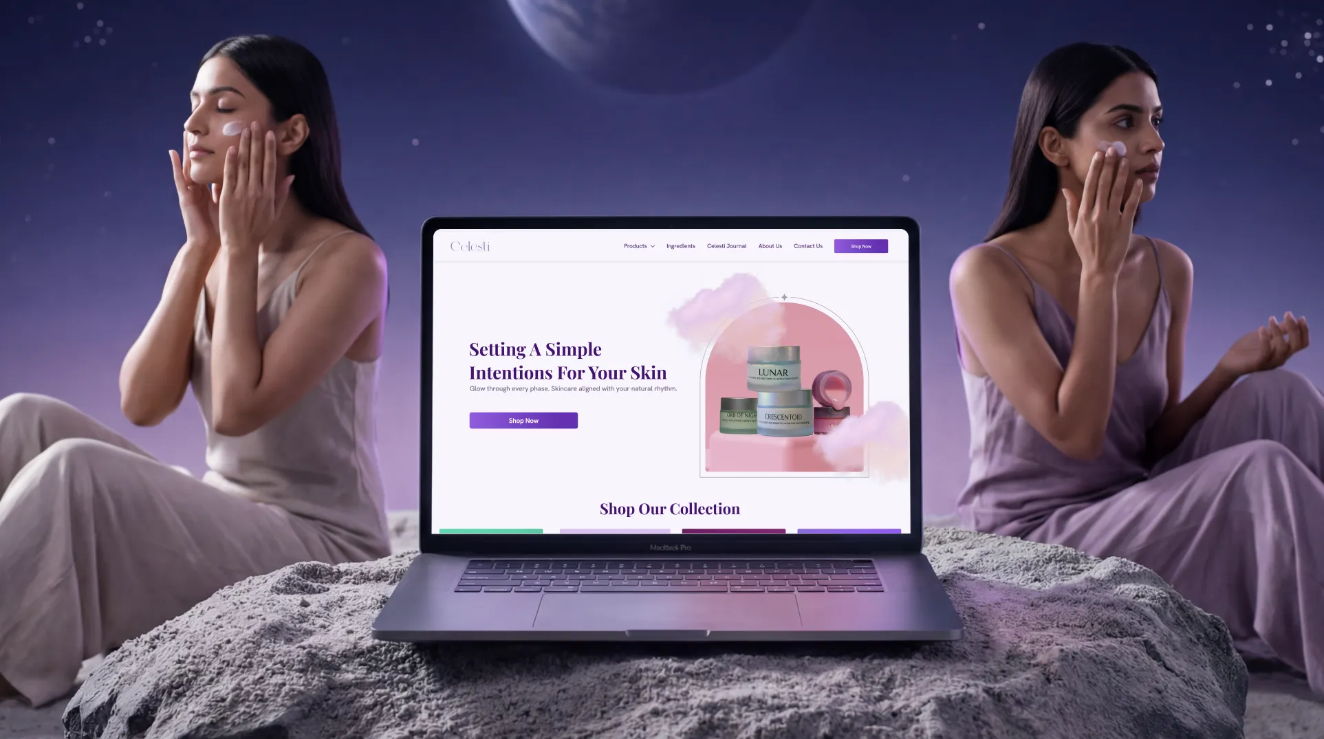 Celesti enters a rapidly evolving Indian skincare landscape alongside brands such as Forest Essentials, 82°E by Deepika Padukone, Suganda, Dr. Sheth’s and d’you, where storytelling, ingredients and design language shape consumer trust just as much as their product performance. The challenge here was to translate Celesti’s dreamy, astrology inspired philosophy into a digital experience that feels elevated and immersive on a website shopping experience.