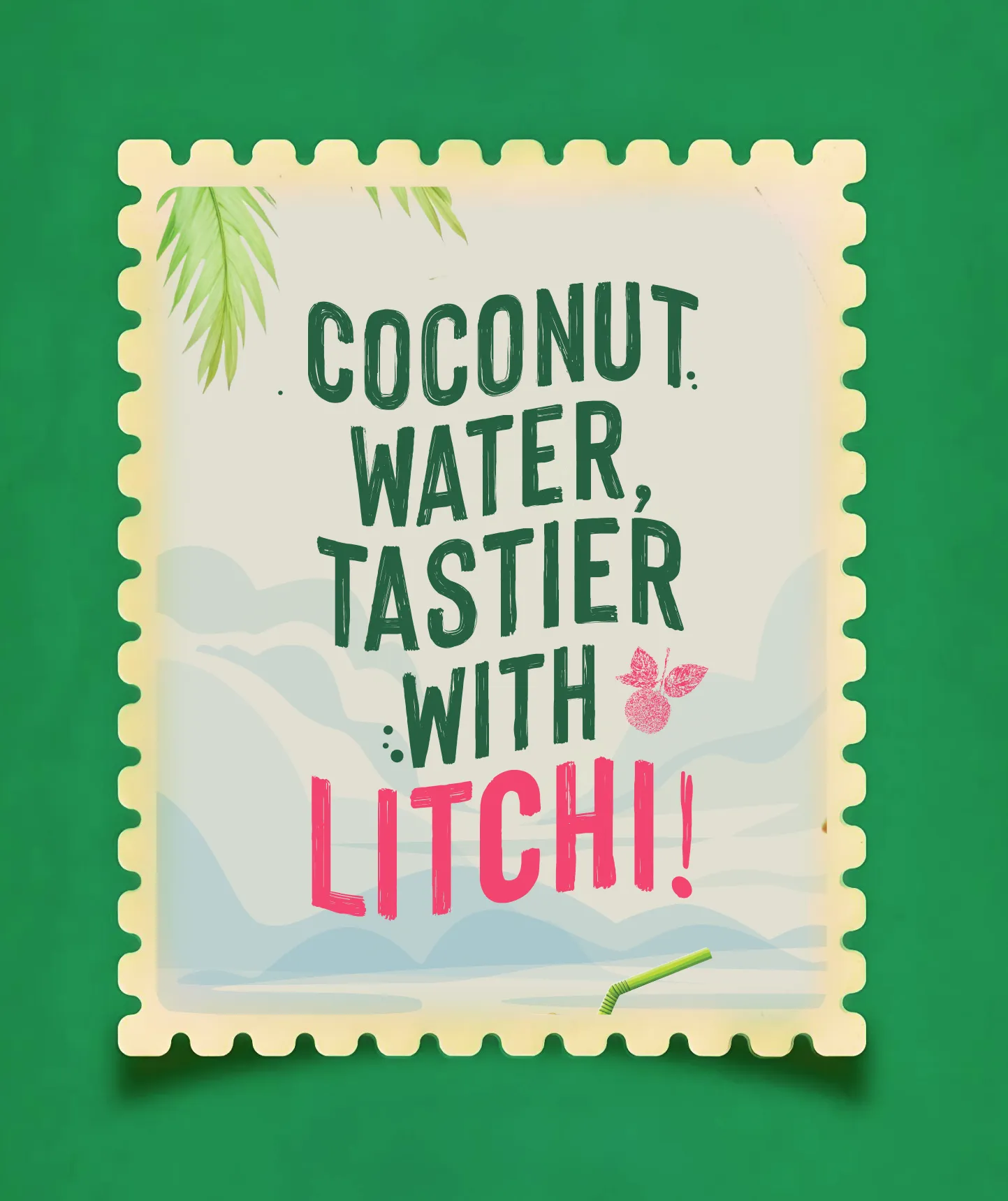 The packaging system is built around a coastal colour palette featuring palm grove green, lime leaf, pale sunshine, coconut husk brown, cloud white, and sunset pink for the lychee variant. These colours create a natural, fresh and inviting shelf presence. The typography takes inspiration from hand-painted lettering commonly seen on boats and roadside signage in coastal regions.