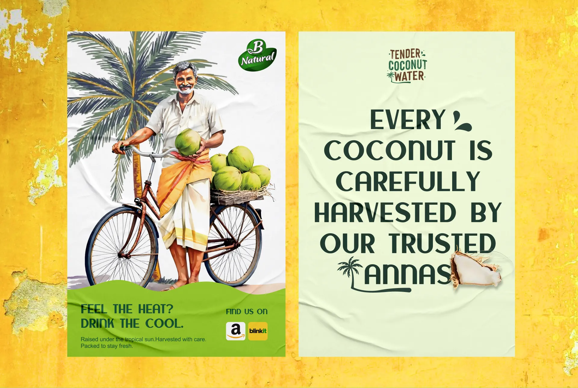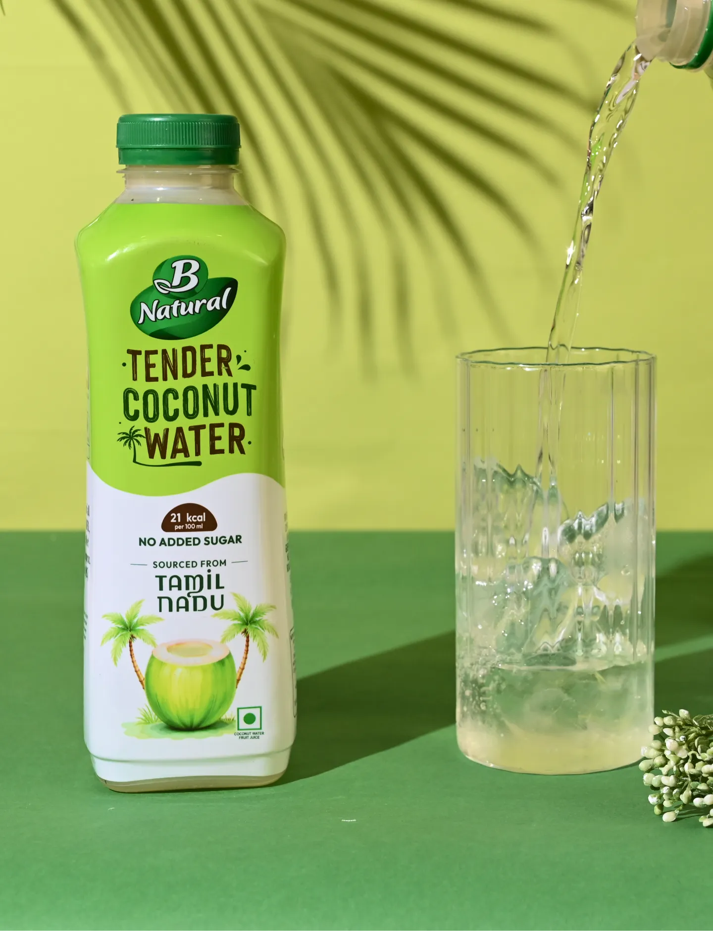 The color palette is rooted in nature. Fresh, vibrant greens form the foundation, instantly communicating wellness, hydration, and the vitality of tender coconuts. These are balanced with crisp whites, symbolising purity, cleanliness, and transparency—key cues for a natural beverage. Subtle coconut and neutral tones add warmth and authenticity, ensuring the design feels grounded rather than overly processed. Together, the palette creates a visually cooling effect, echoing the refreshing experience of the drink itself and enhancing shelf visibility across retail and quick-commerce platforms