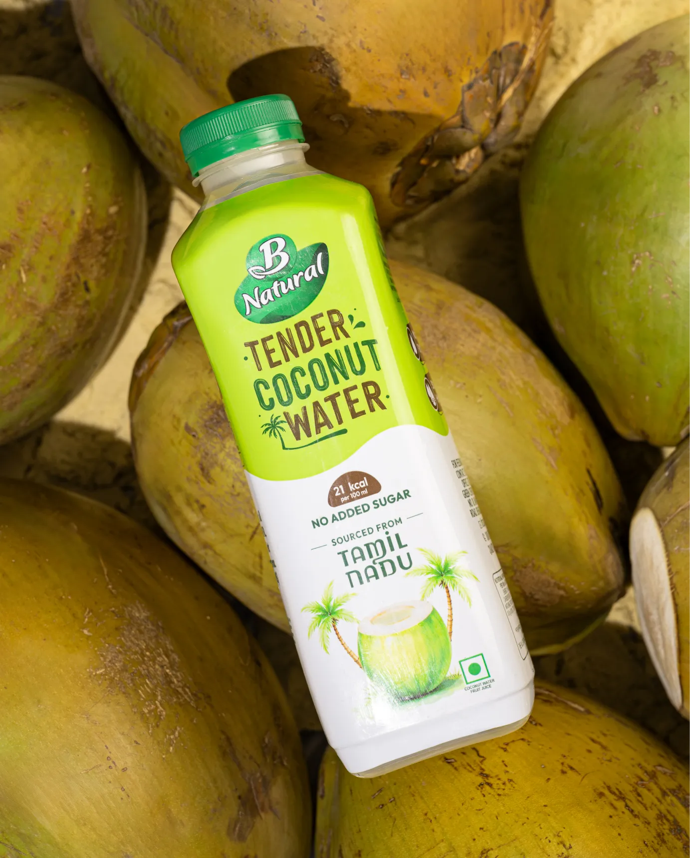 Illustrations include a coconut vendor with a cart, reflecting how coconut water is sold across most Indian states, alongside coconut and palm visuals that reinforce source and freshness.