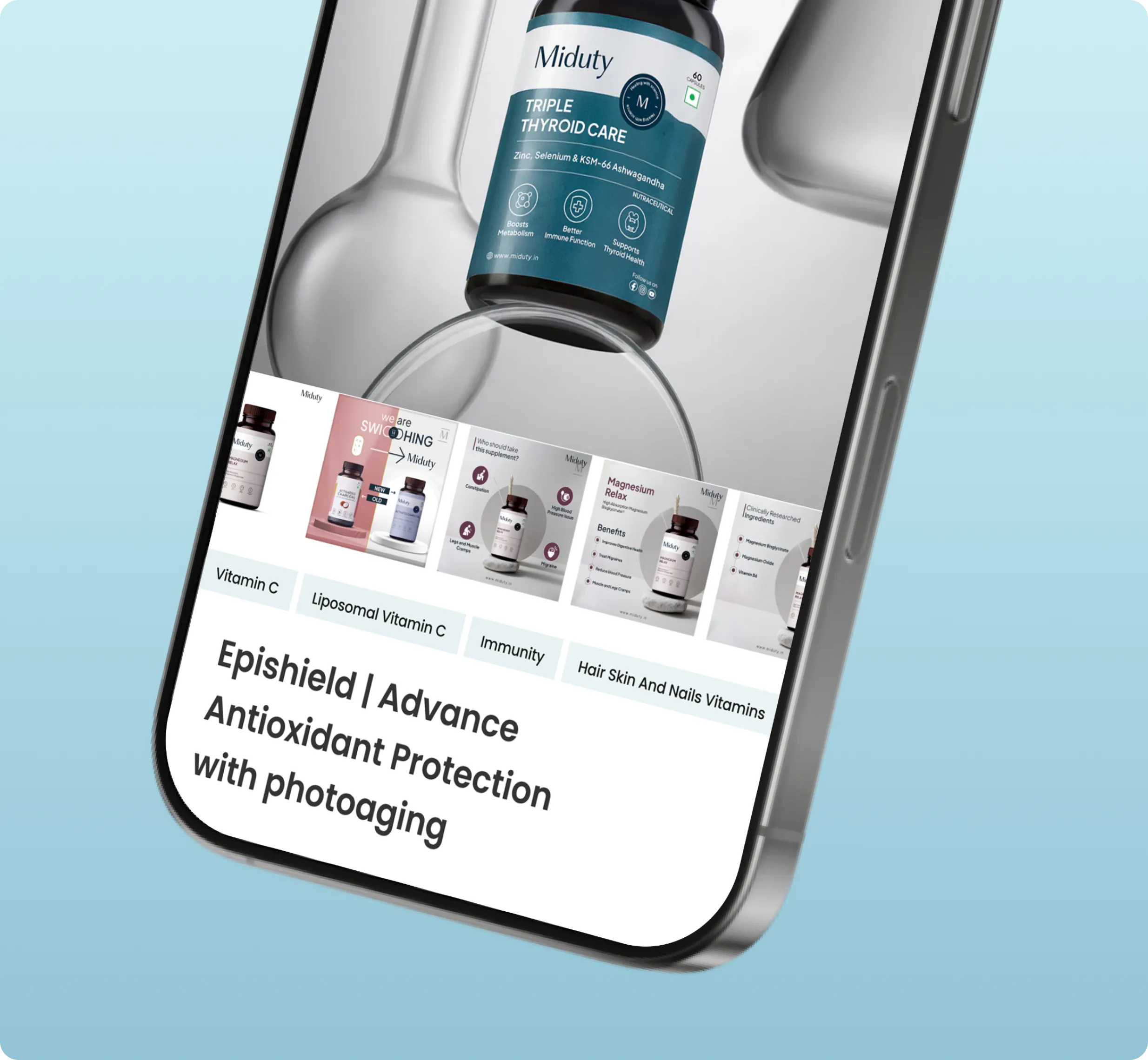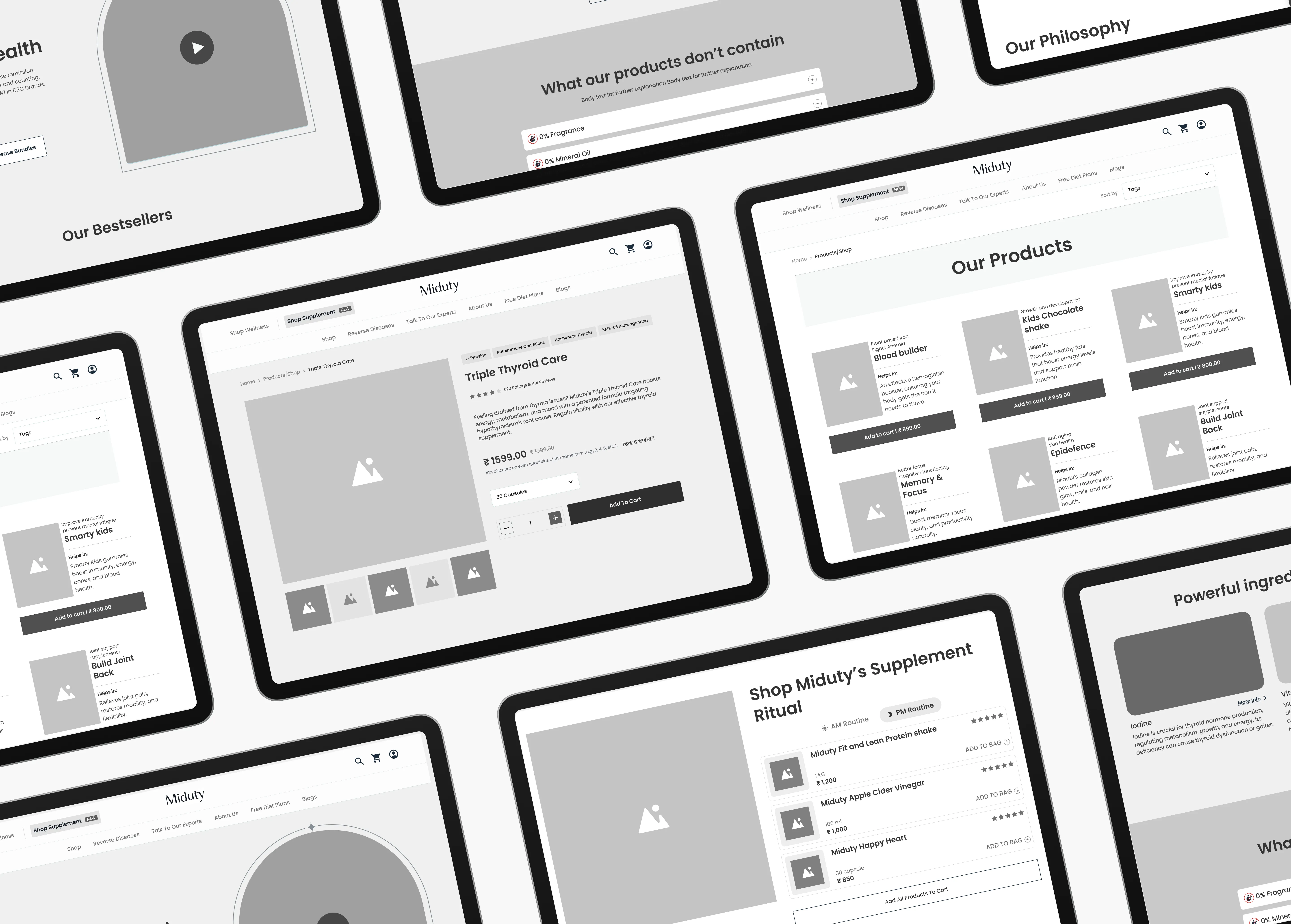 These wireframes served as a foundation for designing a user-centric interface, ensuring that each element supported intuitive navigation and seamless interaction. This step was crucial in aligning the digital experience with Miduty's mission of empowering and simplifying self-care for women.
