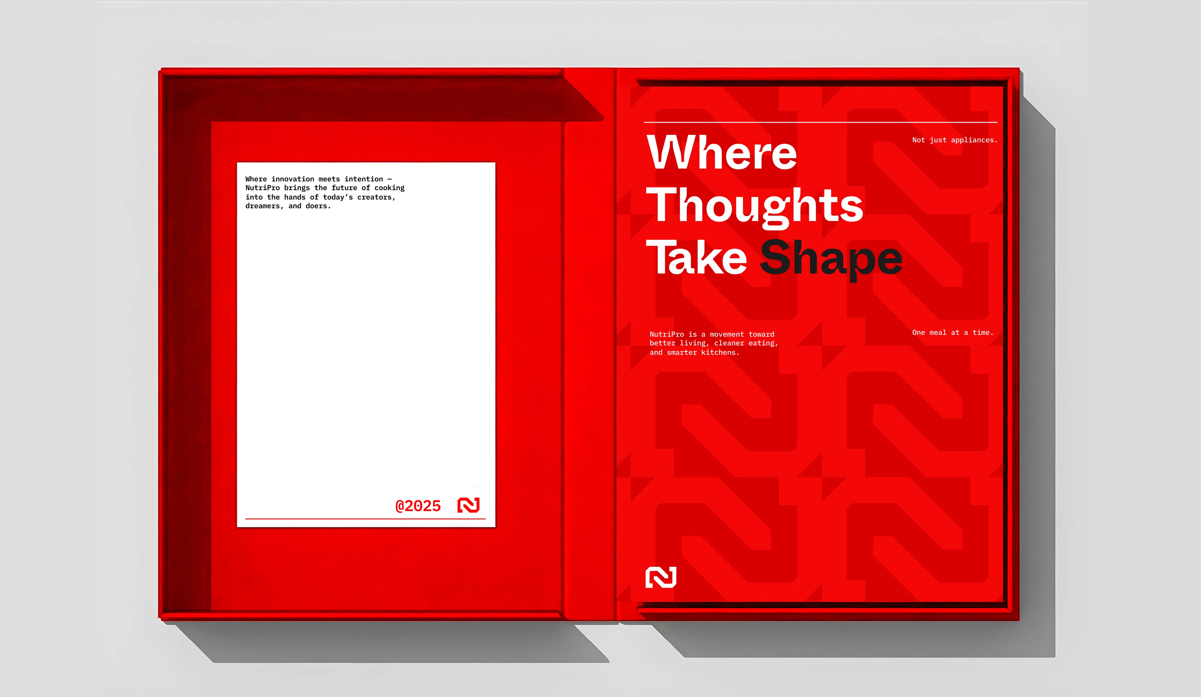 Confetti designed a visual system that mirrors the tech-driven essence of NutriPro. The primary logo, a sleek wordmark and monogram, reflects precision, confidence, and next-gen functionality. The color palette uses crimson red, charcoal black, dark gray, and white to signal performance and power, paired with secondary tones like electric indigo, eco green, and vivid yellow for a burst of energy. Typography blends futurism and clarity through Whyte InkTrap and IBM Plex Mono, creating a bold visual presence. Custom patterns, graphic systems, and photography direction all reinforce a brand built for the future clean, sharp, dynamic, and deeply aligned with modern living.