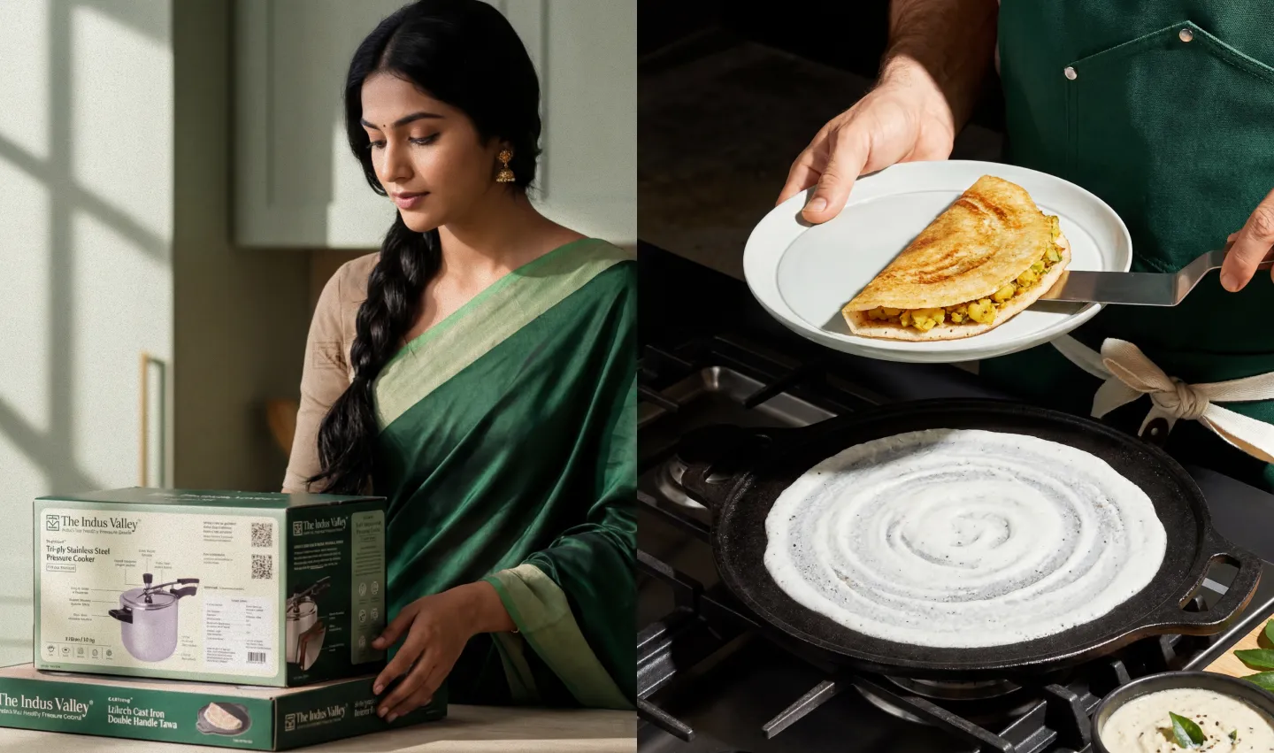 Indus Valley is a cookware brand from Tamil Nadu focused on everyday, safer cooking. Their range spans from stainless steel and cast iron, built for households that care about durability and long-term use without stepping into luxury pricing. It targets mass-premium Indian households consumers who want better quality without luxury pricing.
