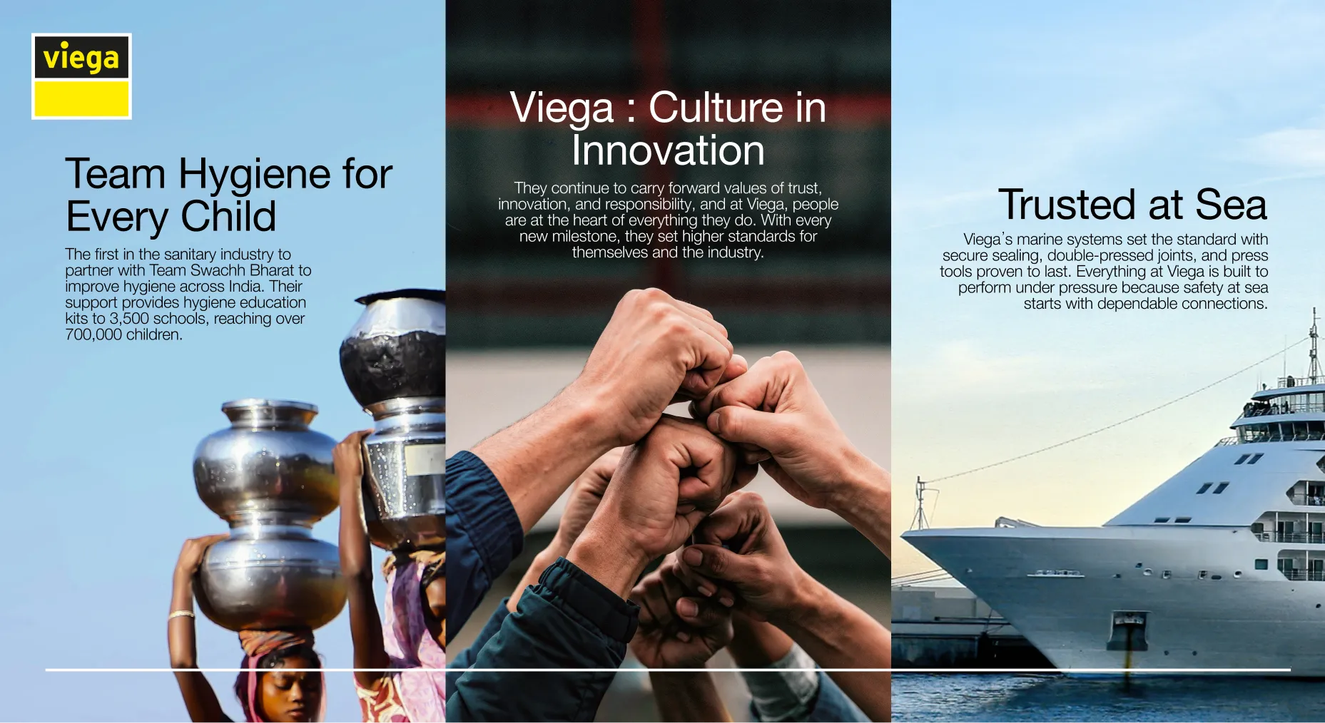 Today, Viega is increasingly perceived as a global force that extends far beyond plumbing solutions. From maritime systems and aviation applications to large scale international infrastructure projects, people now recognise the brand for its engineering reliability, innovation and worldwide presence. The initiatives Viega supports, whether in safe water access, sanitation or community health, further strengthen its reputation as a company driven by purpose as much as performance. Through consistent communication, conscious storytelling and a cohesive brand presence, the world now sees Viega as a partner committed to creating safer environments, advancing global standards and shaping a more sustainable future. This renewed perception reinforces its standing as an international leader whose impact is felt across industries, continents and communities.