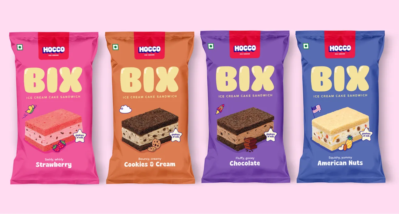 Similarly, the Bix ice cream sandwich stands out for its sponge-cake construction, a deliberate departure from the biscuit-based sandwiches most Indian consumers are used to. These small, thoughtful design decisions not only make the products feel new but also give Hocco memorable visual and experiential cues that extend beyond flavour.