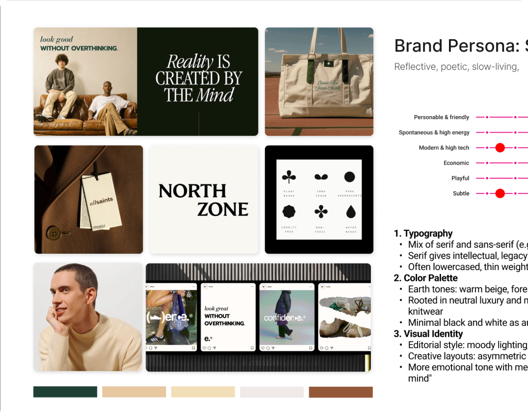 Each mood board is built using a combination of AI-generated imagery, curated photography, model references, sample product visuals, logo styles, typography, colour systems, patterns, and iconography. This allows clients to clearly visualise what different strategic directions could look like at the finish line. By seeing multiple interpretations side by side, clients are able to make informed decisions about which visual language best aligns with their brand’s personality and long-term vision.