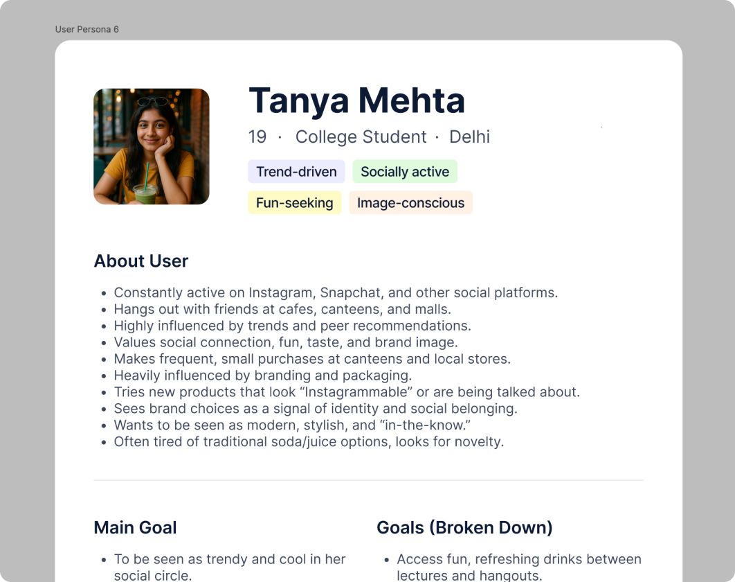 A user persona is a detailed representation of a brand’s most important customer, not every possible customer. It acts as a summary of the audience whose adoption signals wider acceptance of the brand. Many successful Indian brands build with a clear primary user in mind. For example, brands like Sleepy Owl, Rage Coffee, Paper Boat, SuperYou & Yoga Bar, have grown by deeply understanding the lifestyle, motivations, and consumption behaviour of their core audience. A well-defined user persona allows teams to make objective decisions rooted in customer reality rather than designing from personal preference or internal bias.