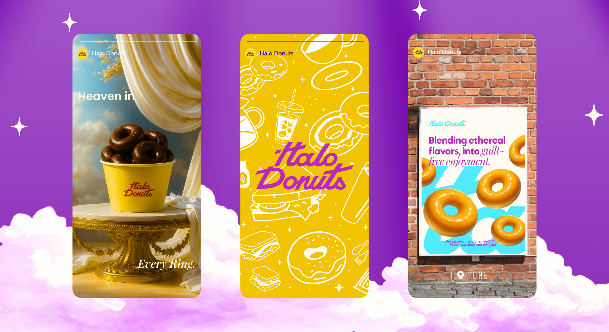 We began by defining how Halo Donuts should feel, not how it should look. The brand needed to feel comforting, slightly unreal, and quietly joyful. Like stepping into a space that softens the day. From there, every design decision followed. The celestial reference of the halo became a subtle anchor rather than a literal theme. We focused on rhythm, warmth and restraint, allowing the brand to breathe and their storytelling to take the centre stage. Instead of forcing attention like the competing patisserie and donut brands in their niche, the identity invites it, through considered visuals, expressive illustration, thoughtful and compelling storytelling and a tone that feels human rather than performative.