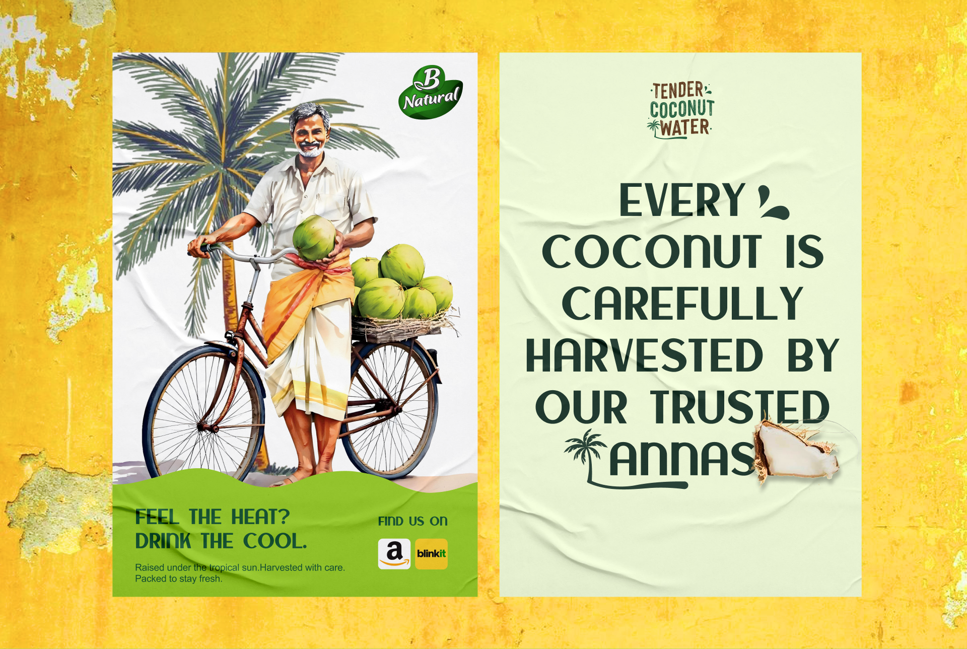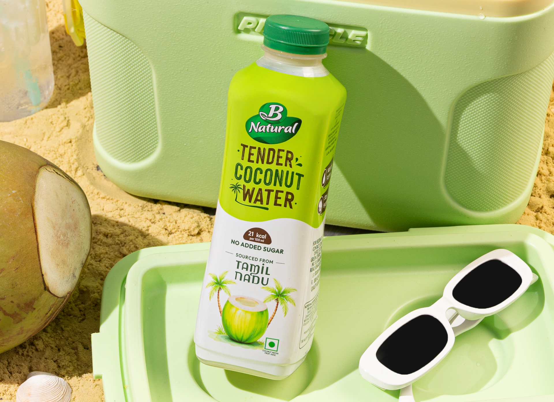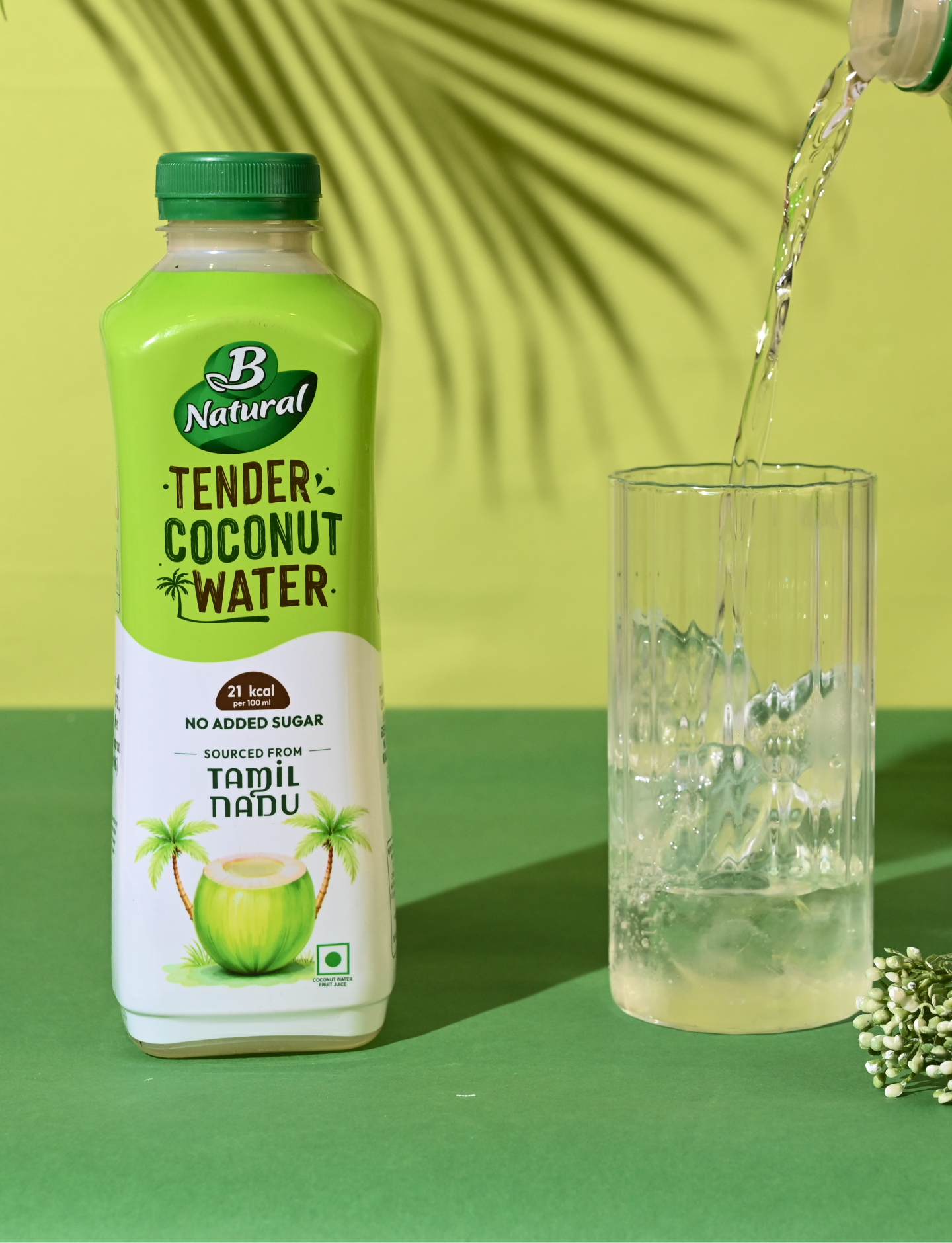 The color palette is rooted in nature. Fresh, vibrant greens form the foundation, instantly communicating wellness, hydration, and the vitality of tender coconuts. These are balanced with crisp whites, symbolising purity, cleanliness, and transparency—key cues for a natural beverage. Subtle coconut and neutral tones add warmth and authenticity, ensuring the design feels grounded rather than overly processed. Together, the palette creates a visually cooling effect, echoing the refreshing experience of the drink itself and enhancing shelf visibility across retail and quick-commerce platforms