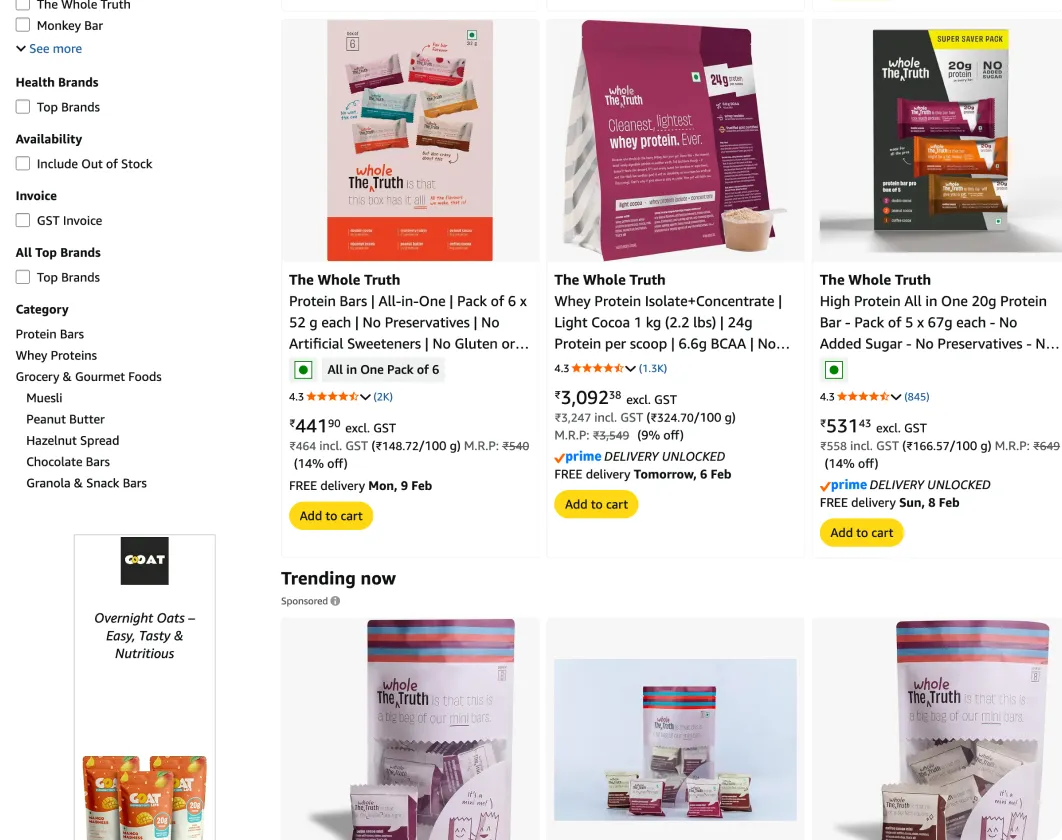 Brands such as The Whole Truth and Mamaearth focus on strong brand blocks, high-contrast colours, and clear typography so the product is instantly recognisable in a grid. Similarly, a coffee brand like Sleepy Owl designs its packaging to stay bold and legible when placed next to competing coffee products in search results. Online packaging is less about how the pack feels in hand and more about how quickly it communicates category, brand, and value on a screen.